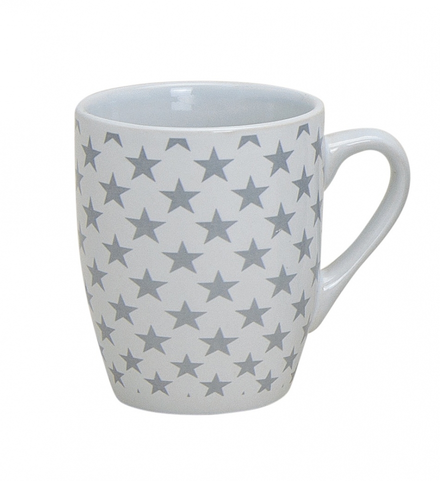 Keramický hrníček s šedýma hvězdičkama na bílém podkladu.