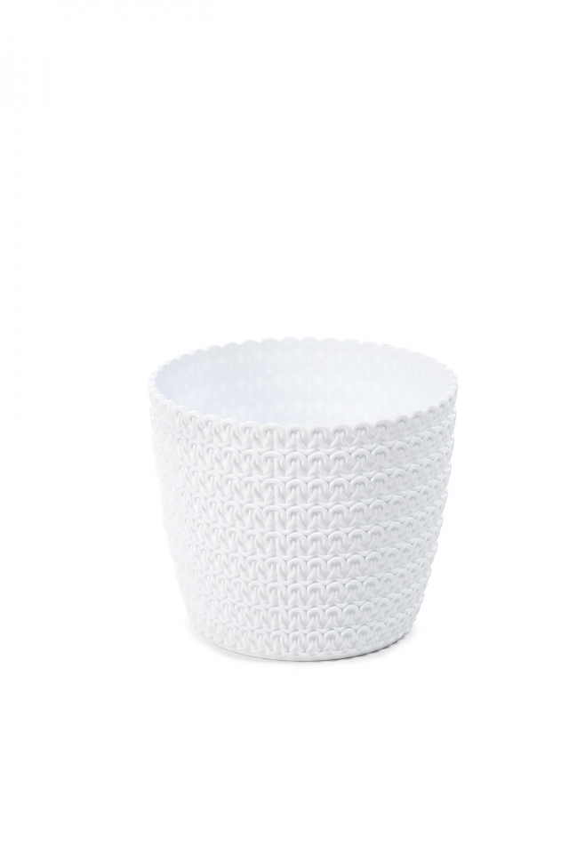 Plastový květináč Magnolia Jersey z vnější strany zdobený pleteným dekorem. Květináče jsou vhodné do interiérů i ven.