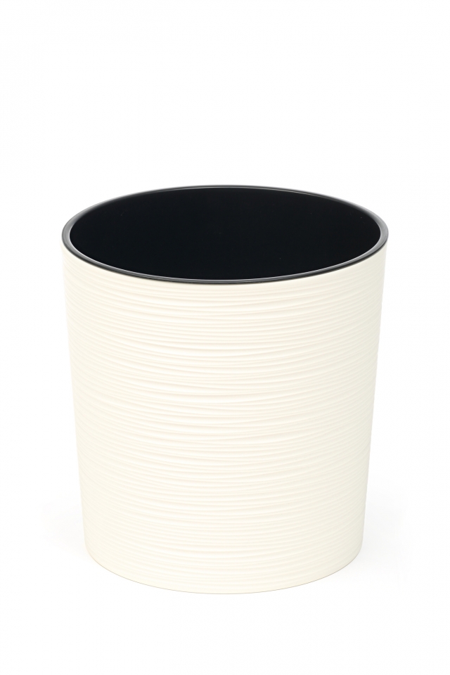 Nízký plastový květináč vroubkovaný s matným povrchem, mírně kónického tvaru a s vyjímatelnou černou plastovou vložkou. Do plastové vložky můžete rostliny přímo sadit a můžete si také ke květináči koupit zvlášť zamozavlažovací systém díky kterému budete mít zálivku stále pod kontrolou.
