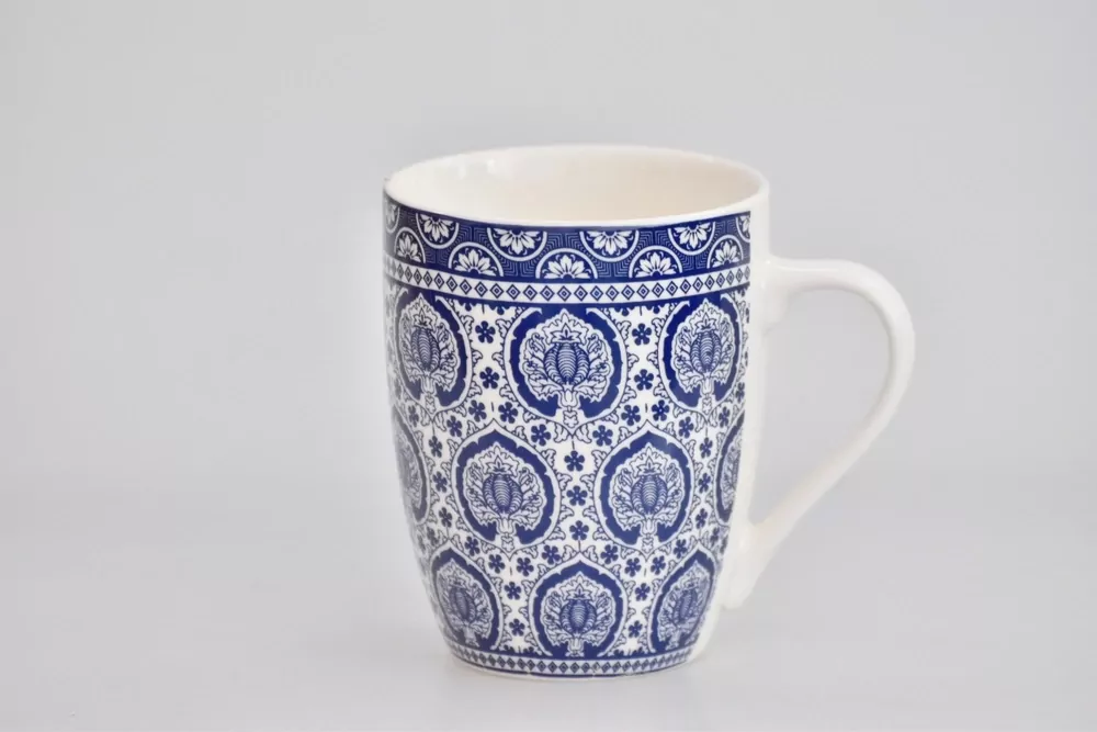 Klasický porcelánový hrnek s dekorem v modré barvě. Hrnek je vhodný na použití do mikrovlné trouby a je možné ho mýt v myčce nádobí.
