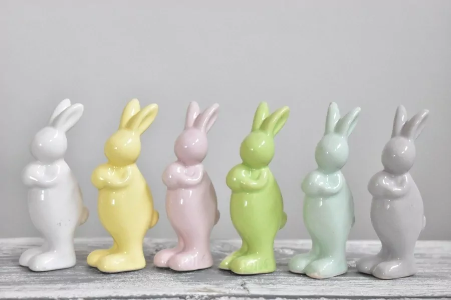 Porcelánový zajíček s vajíčkem. Stylová jarní a velikonoční dekorace. Materiál: porcelán Barva: mix barev - bílá, žlutá, světle zelená, zelená, růžová, šedá Rozměr: výška 7 cm šířka 2,5 cm délka 3 cm celý popis