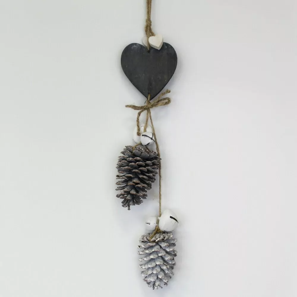 Srdce s rolničkami závěs dřevo/šišky šedá