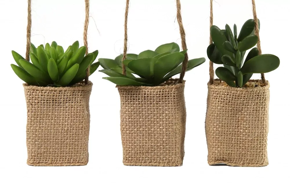 Umělý sukulent v jutovém obalu,na zavěšení. Mix druhů.