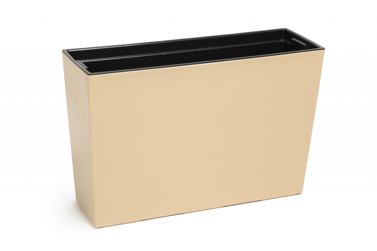 Plastový truhlík s lesklým povrchem. Součástí každého truhlíku je vyjímatejná plastová vložka s oušky pro snadnou malipulaci a knoty. Do plastové vložky se sadí květiny. Přebytečná voda je zachytávaná do vnějšího truhlíku, při nadbytku je potřeba vodu vylévat.