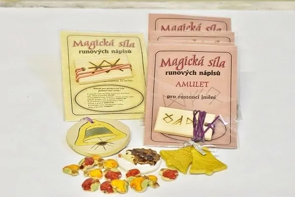 č. 6 Sada obsahuje 22 ks -  5 x AMULETY (různé nápisy),  3 x keramická placka malá,  13 x keramické ovoce - možnost navléct na provázek, 1 x zvonečky s mašličkou