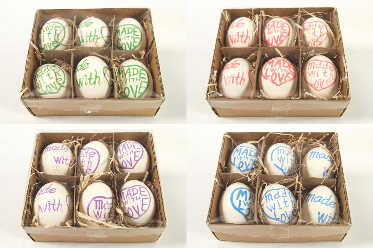Sada 6 ks velikonočních vajíček s nápisem. Designová vajíčka v různých barvách v dekorativní papírové krabici.