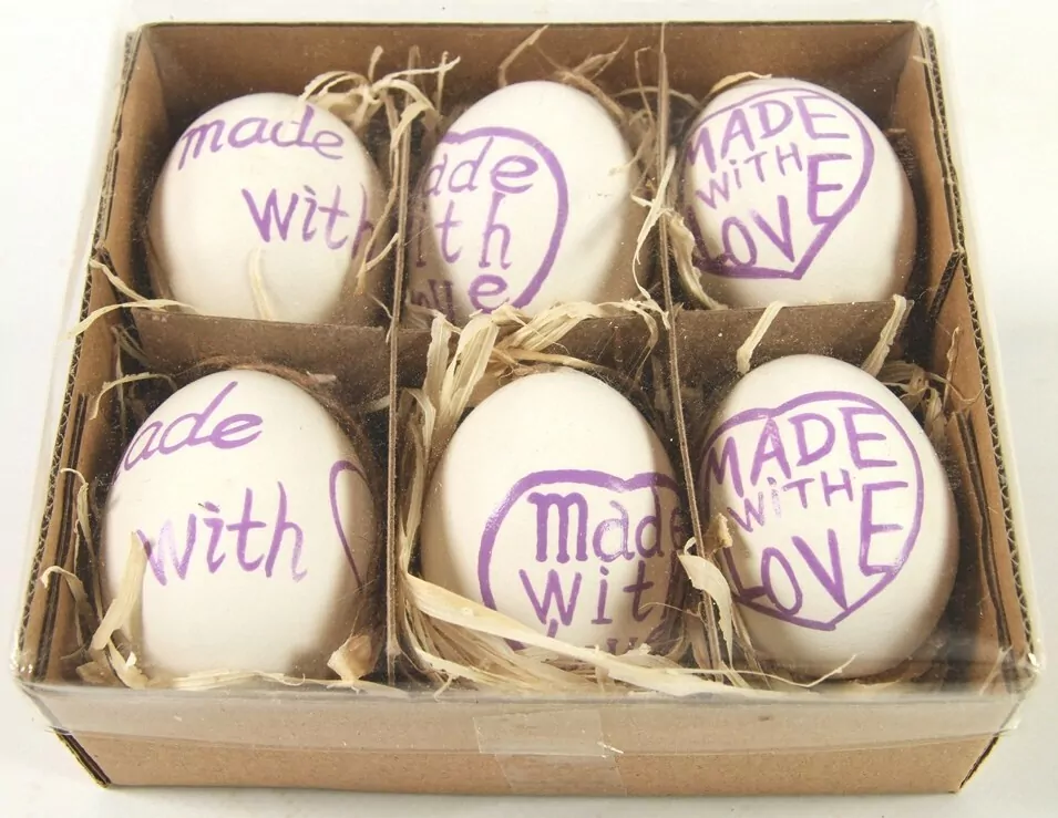 Sada 6 ks velikonočních vajíček s nápisem. Designová vajíčka v různých barvách v dekorativní papírové krabici.