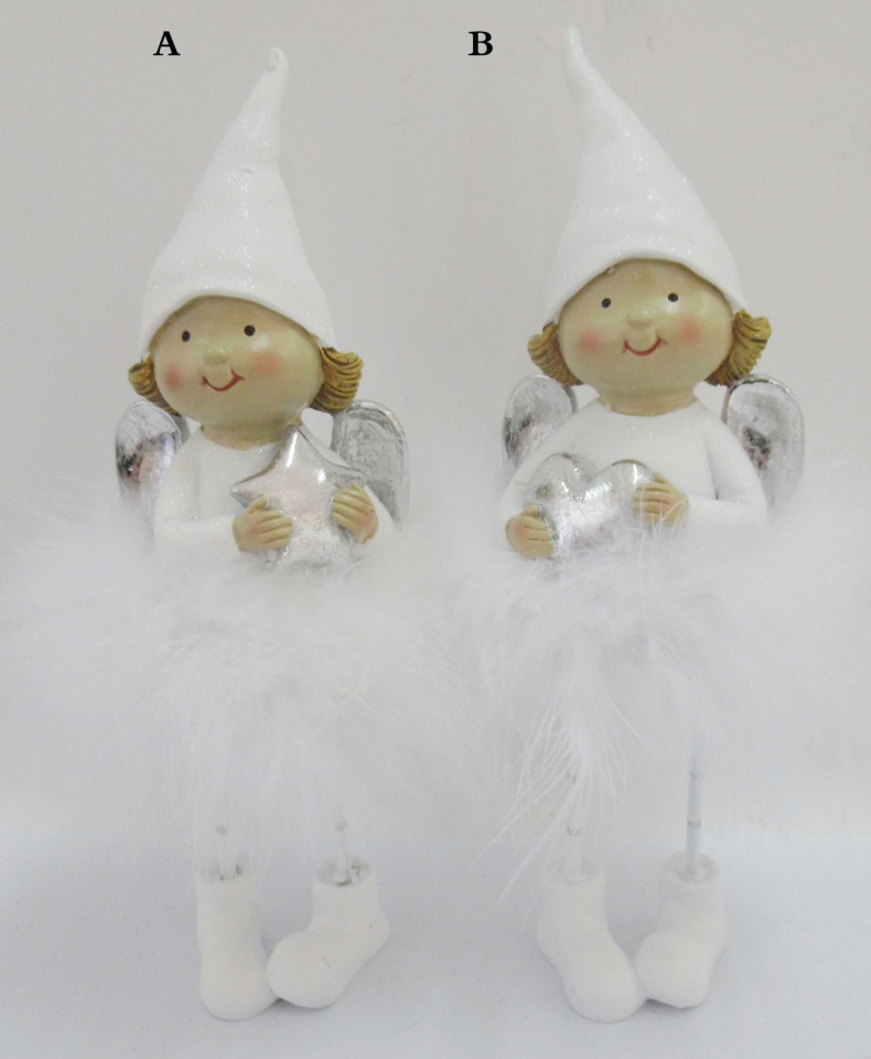 123035 015 BNP-8-01919-21 anděl Bílý andílek s boa sukýnkou a čepicí. V ruce drží srdíčko nebo hvězdičku. Materiál: polyresin Rozměry: výška 23 cm šířka 7 cm hloubka 7 cm celý popis