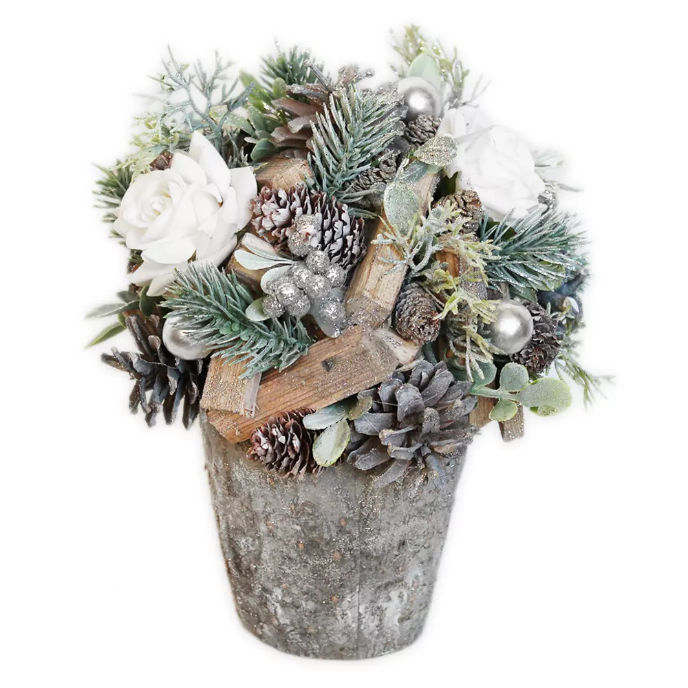 Aranžmá šišky/růže v22cm natural/bílá