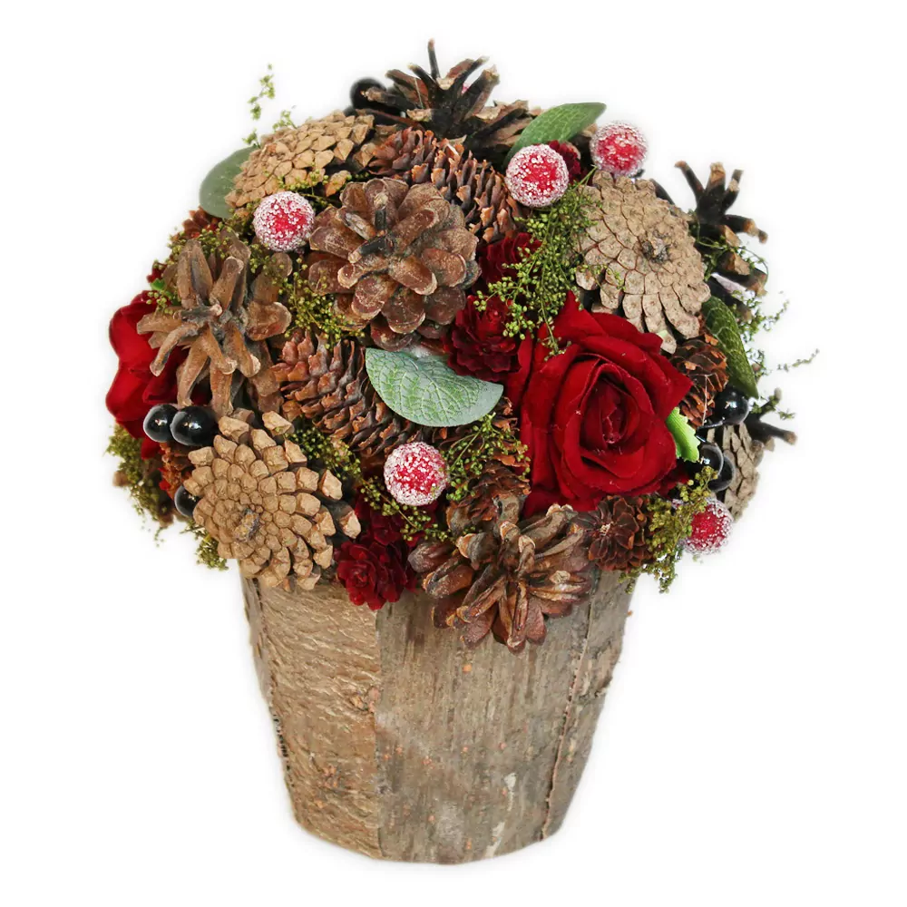Aranžmá šišky/růže v22cm natural/bordó