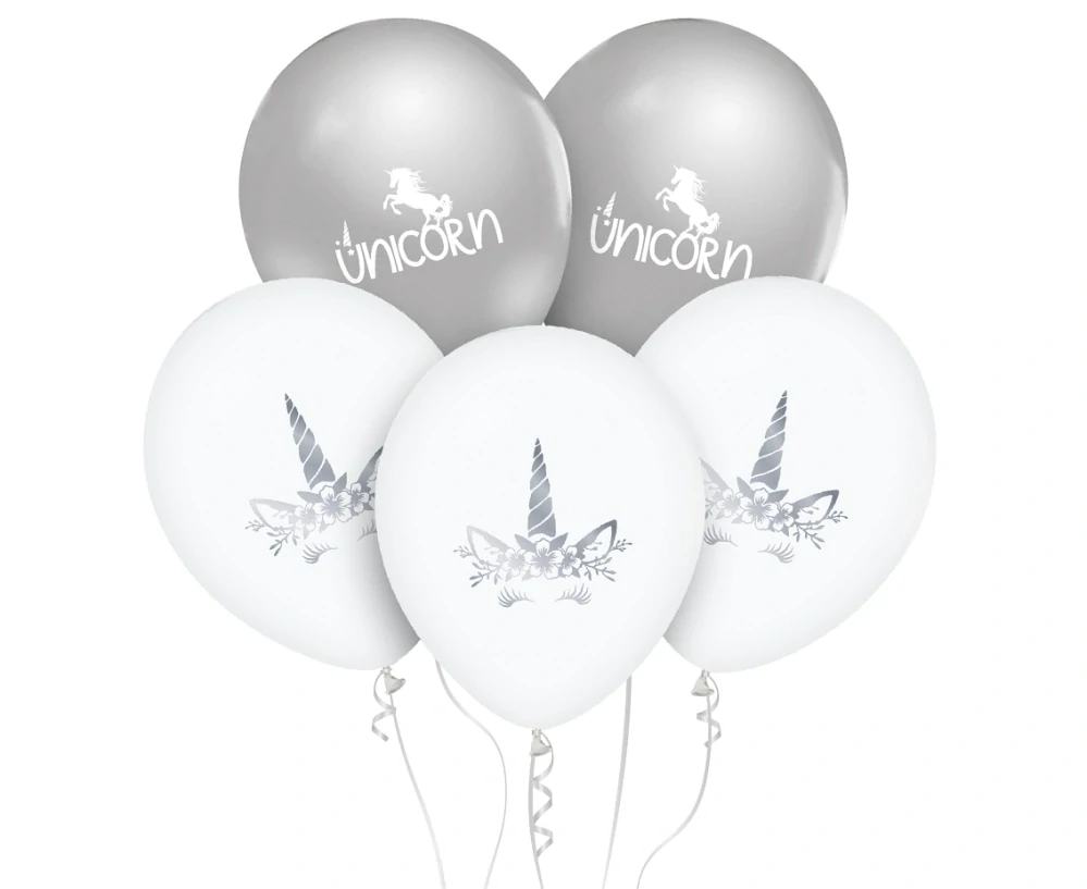 Balónky jednorožce, bílo-stříbrné, 30 cm, 5 ks.