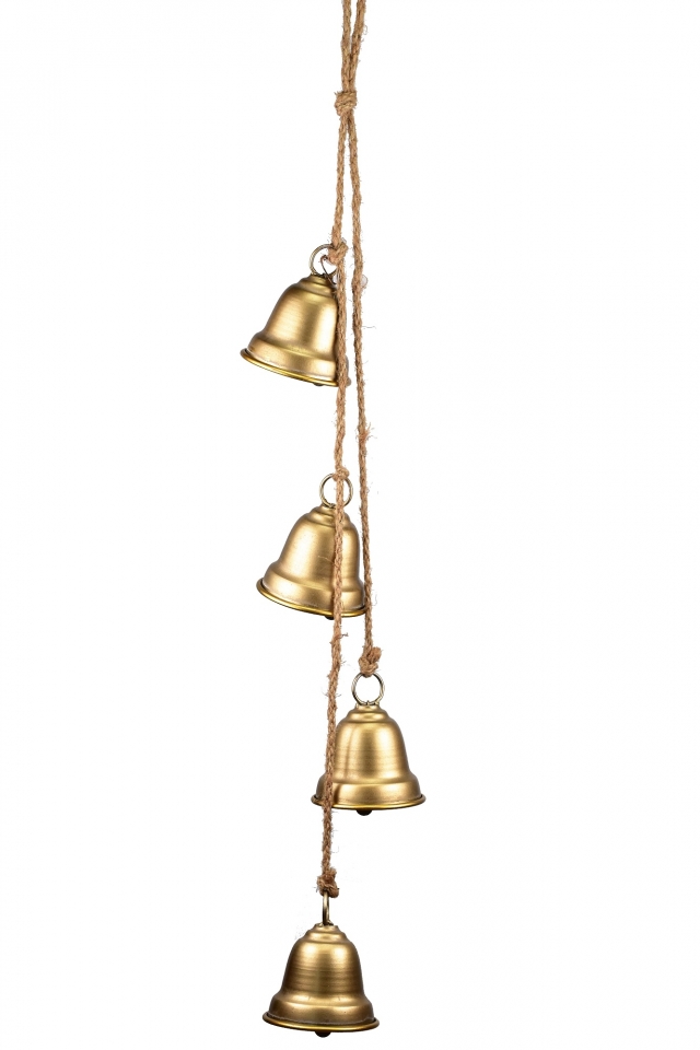 - Čtyři staro-zlaté kovové zvonky na jutovém provaze 9x7,7x75 cm