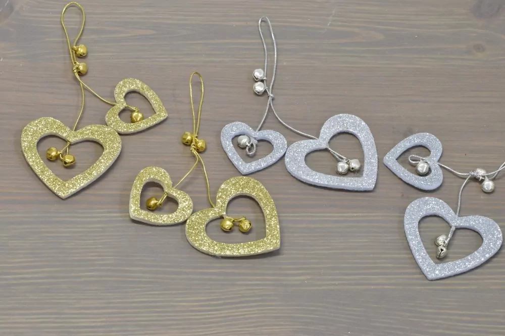 Dekorativní srdíčka na zavěšení s rolničkama. Mix barev zlatá a stříbrná. Na jednom závěsu jsou dvě srdíčka a rolničky. V jedné sadě 4 závěsy (2 x zlatá, 2x stříbrná)