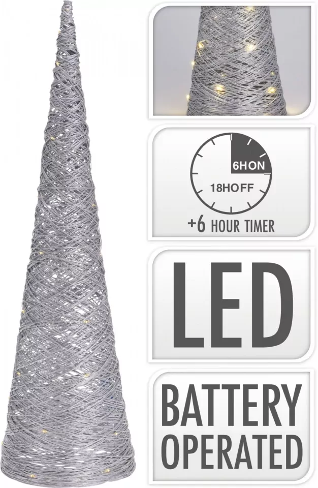 Dekorativní kužel z rafie s LED osvětlením a časovačem. 30 LED diod teplé bílé barvy. Stylová dekorace na krb nebo okenní parapet. Napájení 3x AA tužkovými bateriemi. Vestavěný časovač vám umožní zapomenout na zapínání a vypínání, stačí jej jednou nastavit a bude zapnutý 6 hodin a poté se po 18 hodinách znovu rozsvítí.