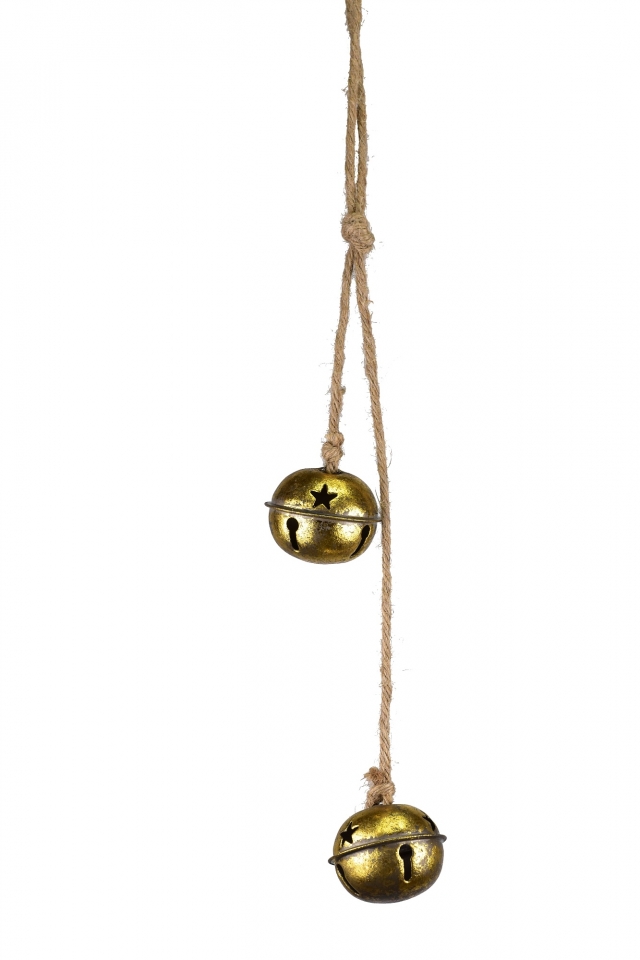 - Dvě zlaté kovové rolničky na jutovém provaze 4x5x38 cm