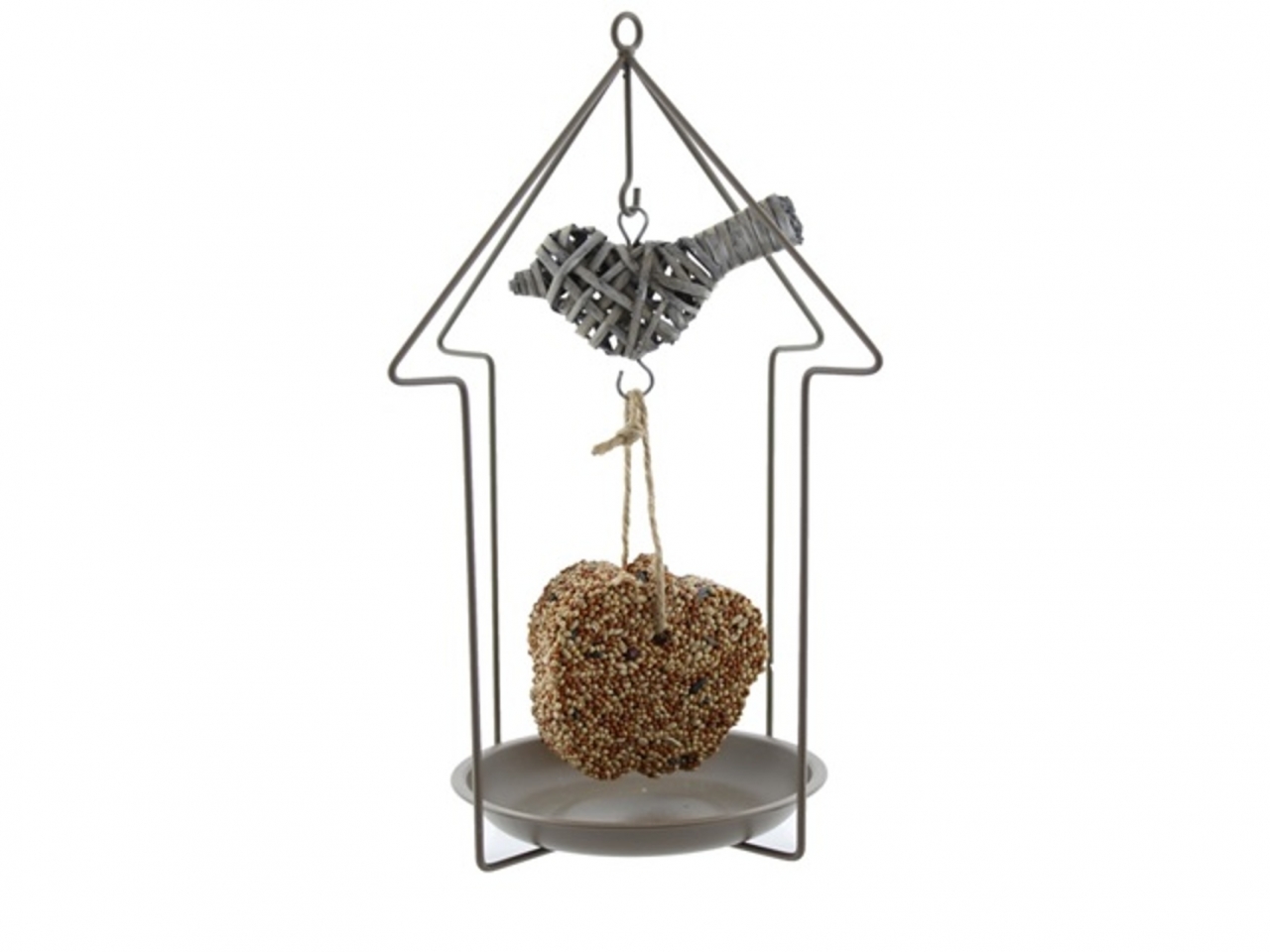 Kovové krmítko pro ptáky s proutěným ptáčkem. Krmení není součástí balení.