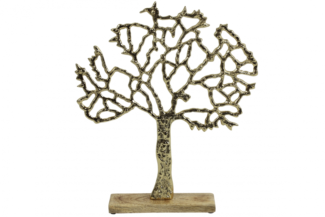 Dekorativní kovový strom života na dřevěném podstavci.