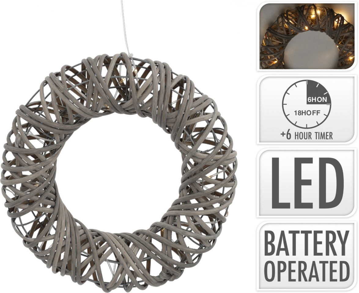 Dekorativní věnec z umělého ratanu s 15 LED diodami teplé bílé barvy. Napájení 2x AA bateriemi (nejsou součástí výrobku). Součástí adaptéru časovač 6/18 h.