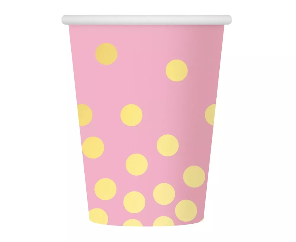 Růžové papírové kelímky se zlatými puntíky.