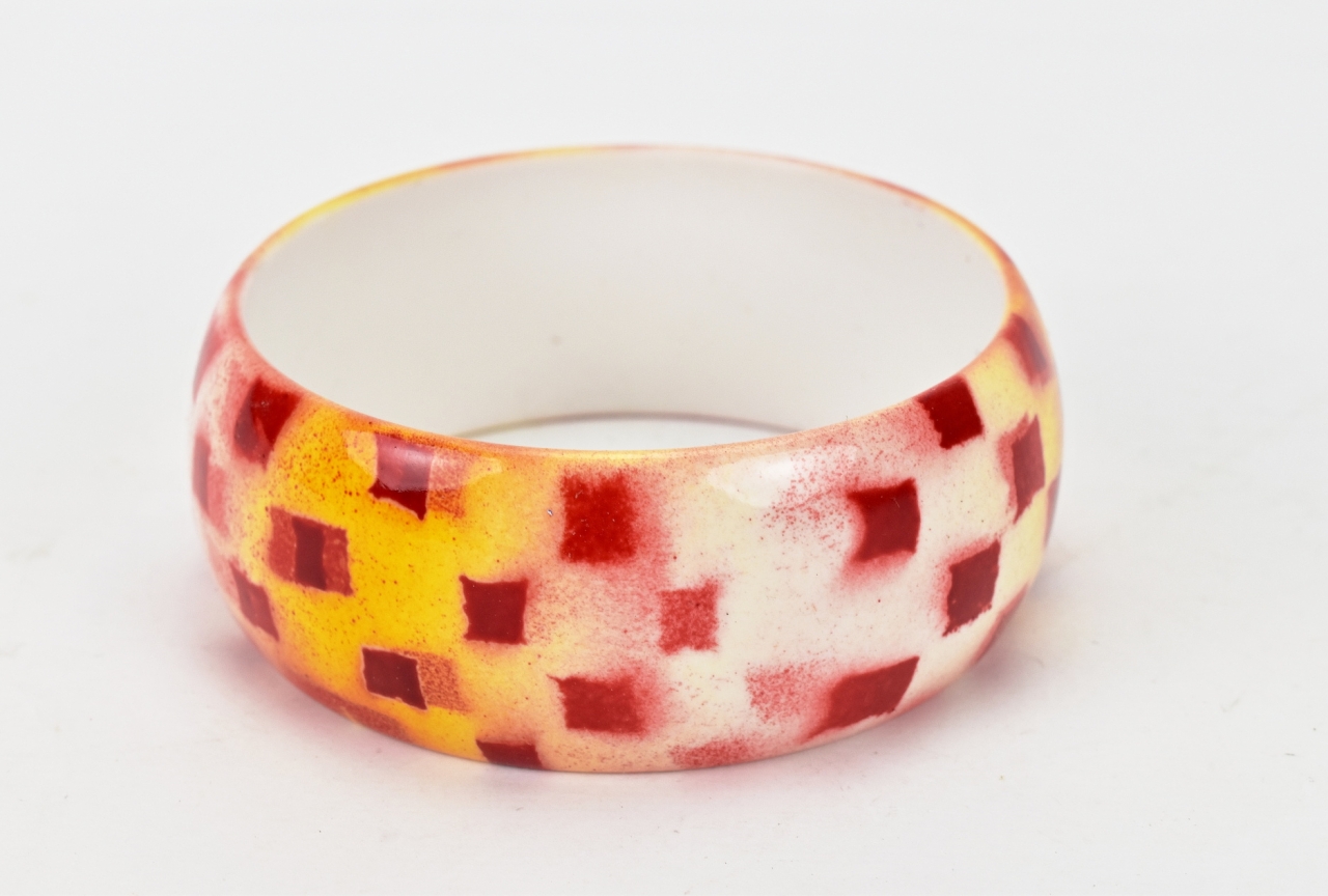 Plastový dámský náramek s motivem vícebarevných čtverečků.