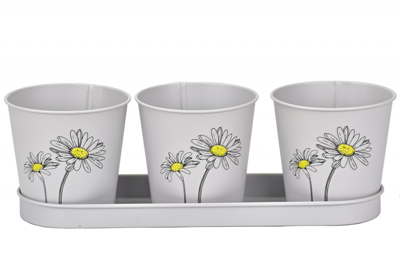 Sada 3 ks plechových květináčů s kopretinou na tácku. Květináče nejsou 100% vodonepropustné.