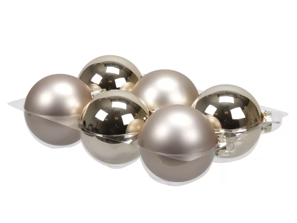 Sada 6 ks skleněných baněk v barvě autumn blonde. V sadě jsou namíchané lesklé a matné baňky.