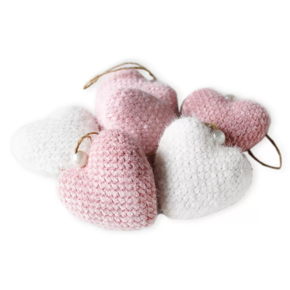 Srdce závěs textil 6ks/6cm růžová/bílá