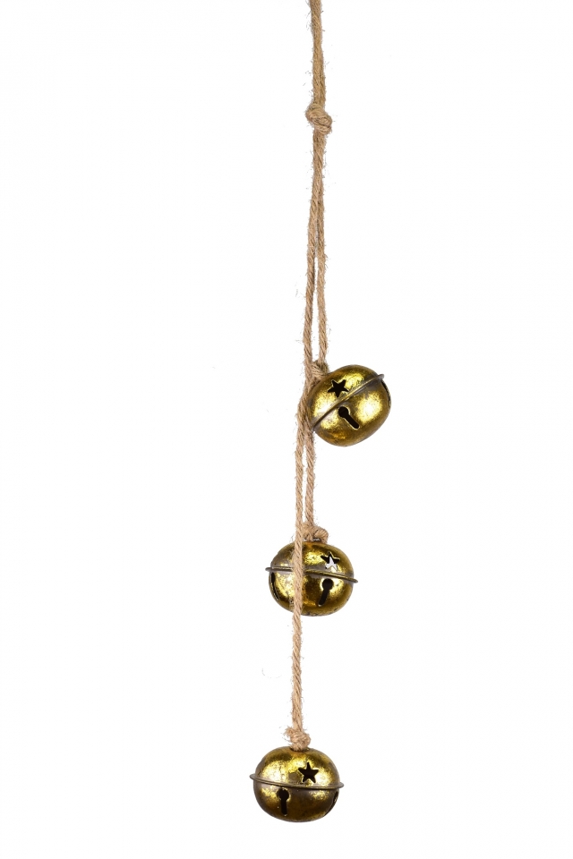 - Tři zlaté kovové rolničky na jutovém provaze 4x5x45 cm