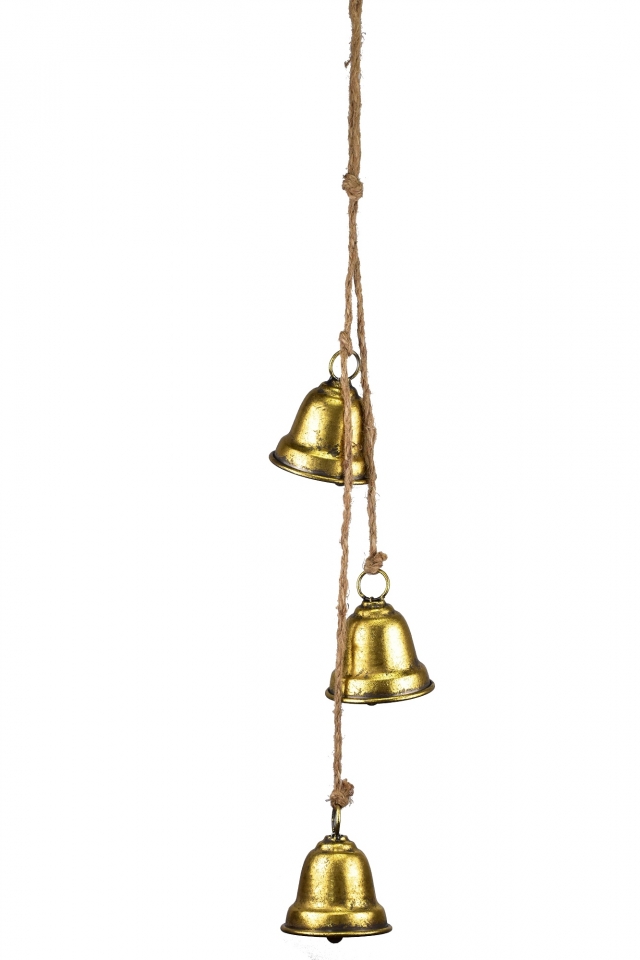 - Tři zlaté kovové zvonky na jutovém provaze 9x7,7x63 cm