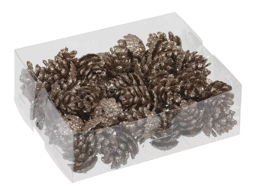 Dekorativní umělé šišky s glitry v barvě champagne. V sadě je 48 ks šišek.
