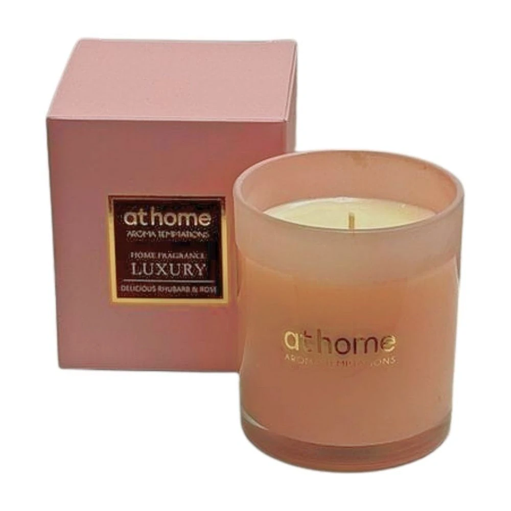 Směs parafínového a palmového vosku s 1 bavlněným knotem ve skleněné nádobě, v dárkové krabičce. Vůně rebarbory a růže.
