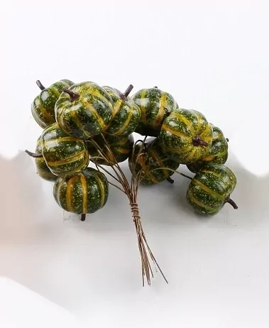 Svazek 12 ks dekorativních polystyrénových dýní na drátku. Vypadají téměř jako pravé dýně ze zahrádky. Jejich výhodou je, že je můžete bez obav použít i v dalším roce. Dýně jsou krásné v podzimních aranžmá v truhlících, květináčích, věncích i kyticích.